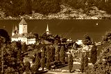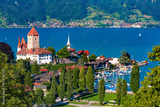 Spiez Church and Castle on the shore of Lake Thun with yachts in the Swiss canton of Bern, Spiez, Switzerland.
