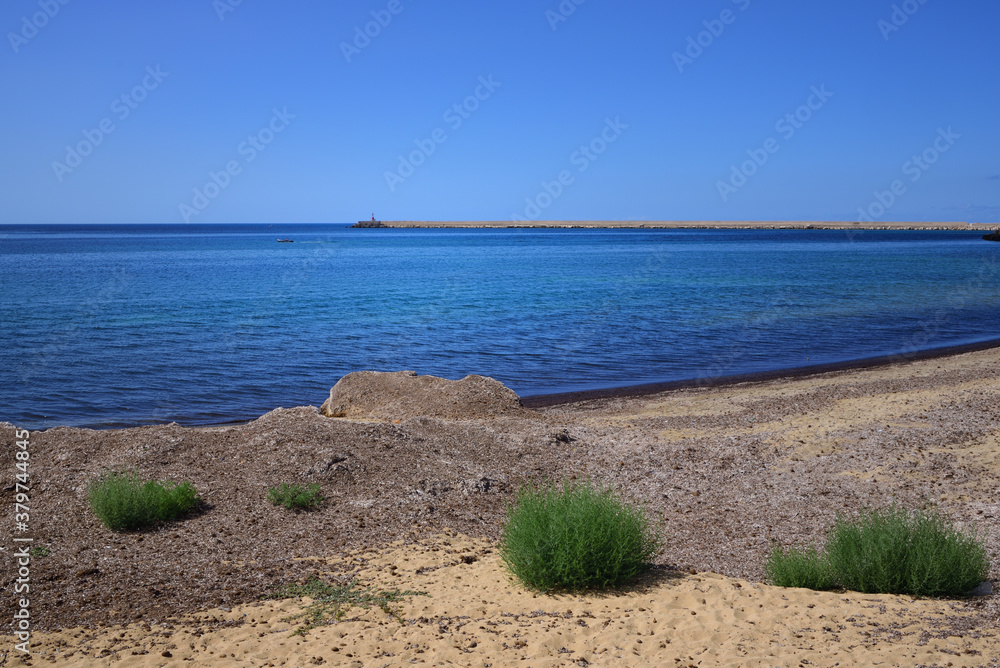 Scenic shot of the Mediterranean Sea, from a coast with little vegetation, of a harbor wall and small ships