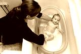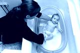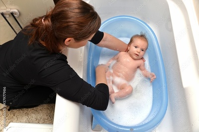 baignoire bébé nouveau-né dans une baignoire bleue par la mère