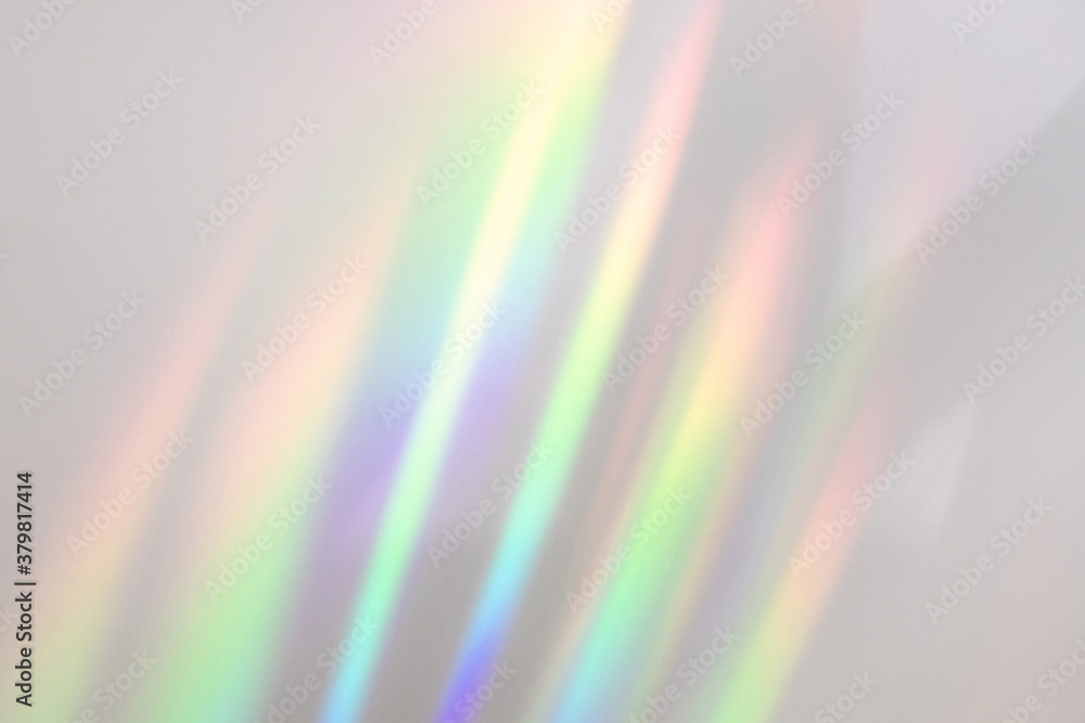 Blurred rainbow light refraction texture overlay effect for photo and mockups. Organic drop diagonal holographic flare on a white wall. Shadows for natural light effects