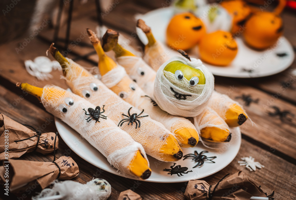Sweet table with fruits and treats for Halloween. Decorations Apple bananas in the form of a mummy with eyes and Ghost. spiders and cockroaches