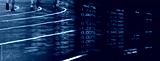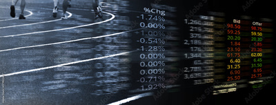 running leg of man on completion track with market trading stock and index number on glow blue red green digital technology banner business concept background