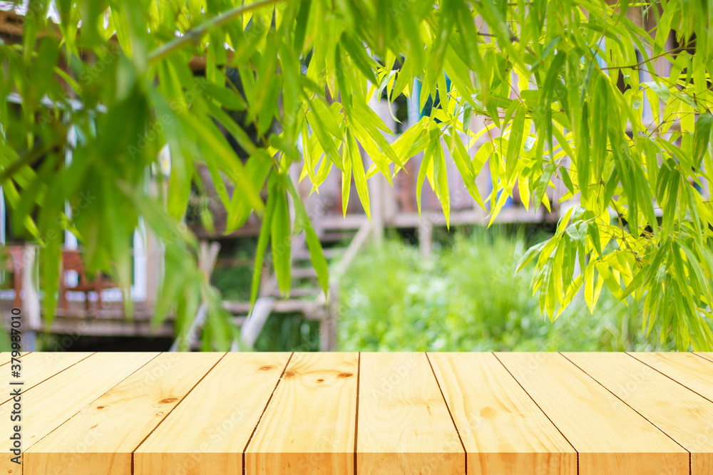 Wood floor with blurred trees of nature park background and summer season, product display montage