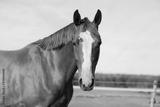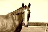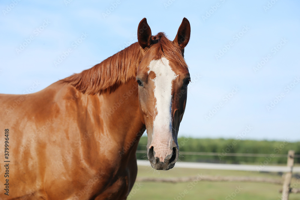 Portrait head shot of a thoroughbred chestnut colored horse in summer paddock under blue sky