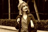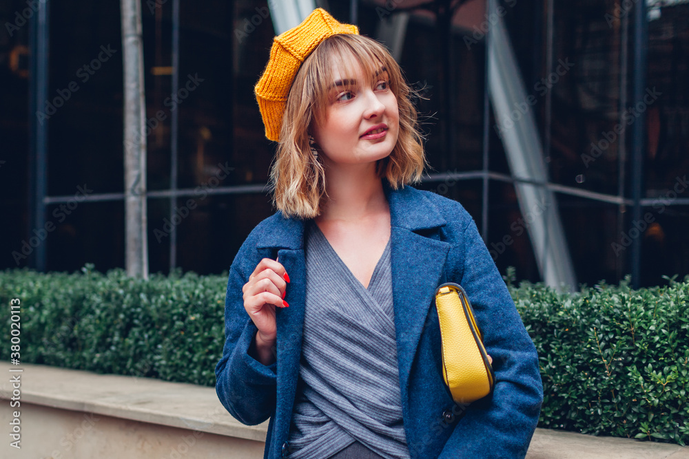 Close up of stylish young woman wearing yellow beret coat holding purse outdoors. Autumn fashion female accessories