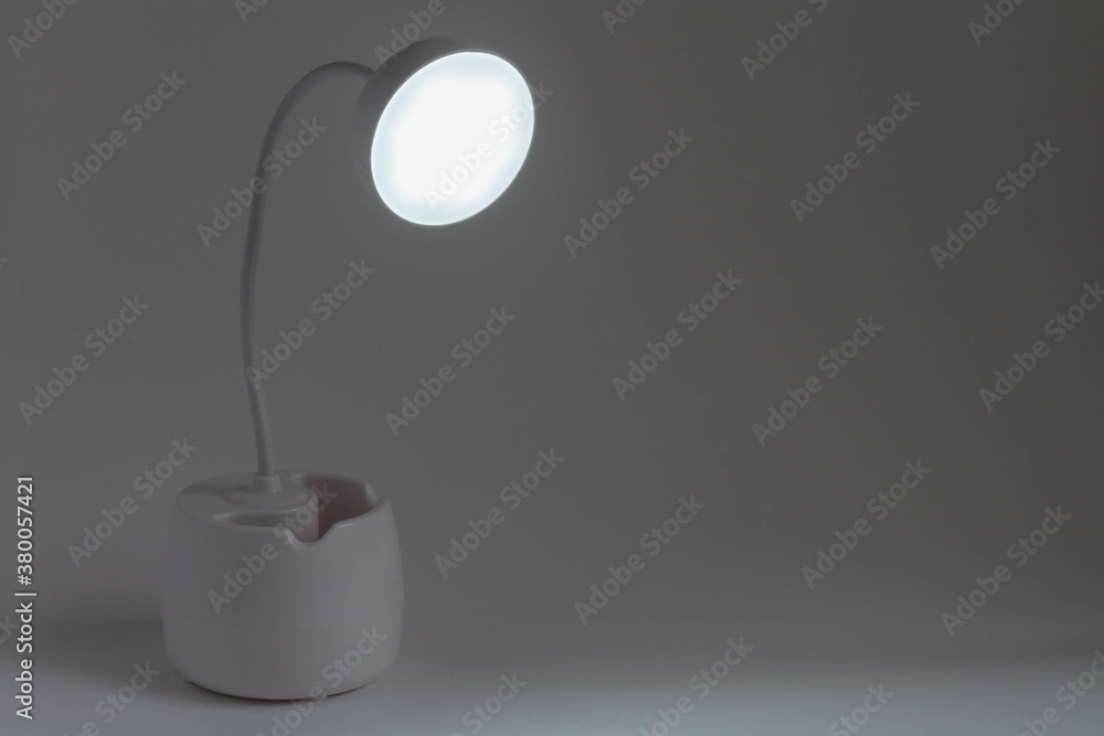 White table lamp on a dark white background. The lamp shines a pleasant white light, illuminates the shadows.
