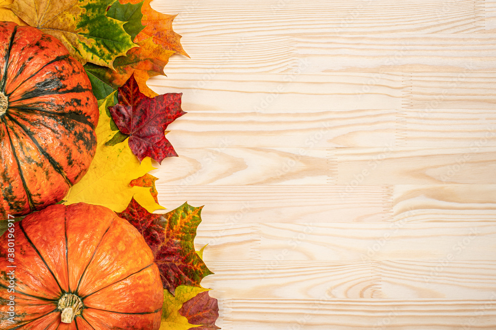 Autumn composition of fallen leaves of maple and pumpkins on wooden table, thanksgiving holiday party background.
