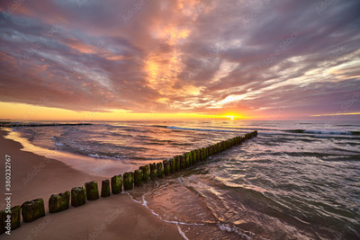 Scenic sunset over Baltic Sea with an old wooden breakwater on the beach.