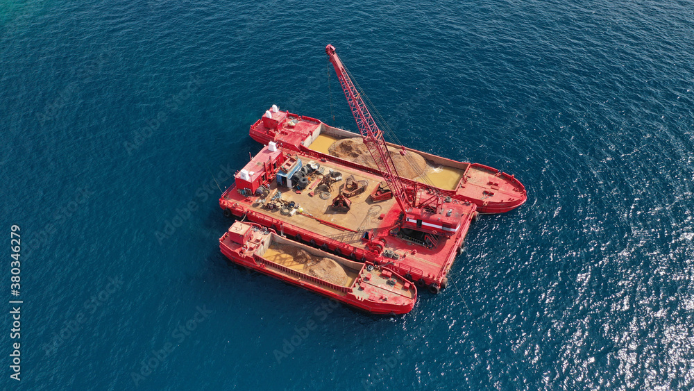 Aerial drone photo of construction ships and cranes building port of Piraeus expansion pier by pouring mud and sand to the sea, Attica, Greece