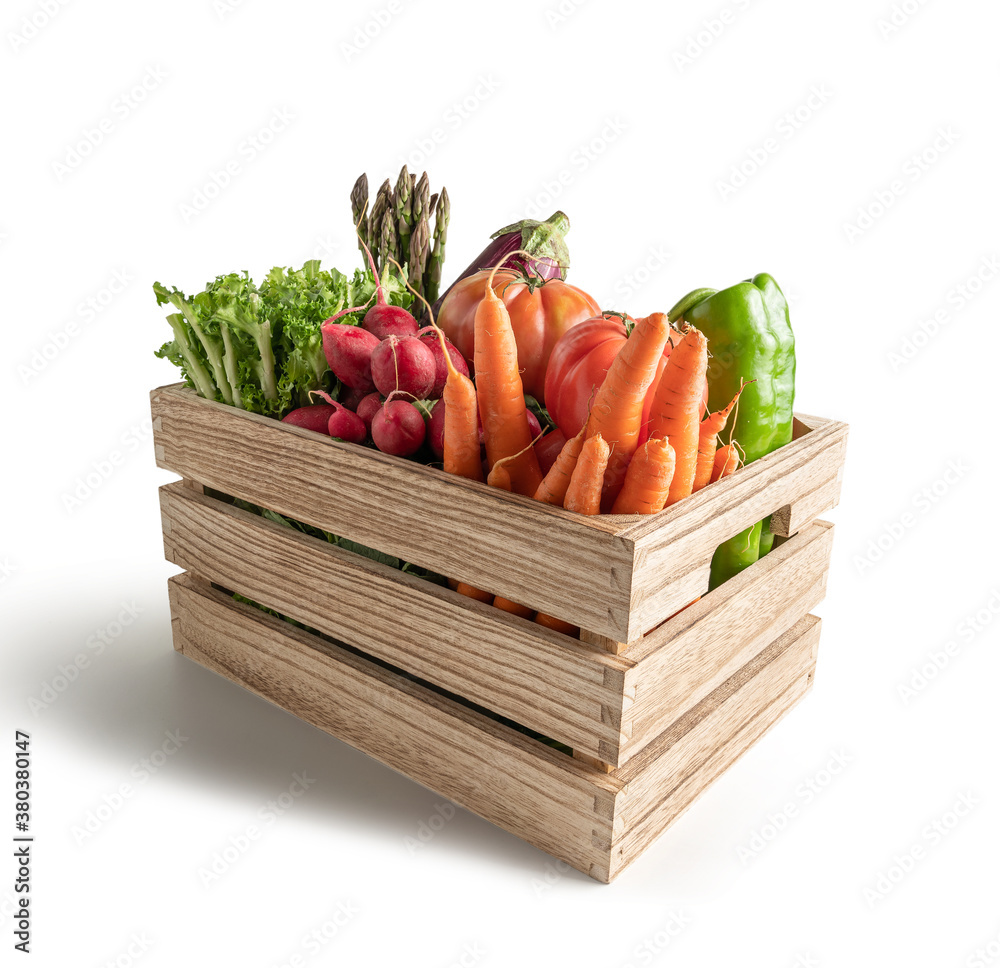 Fresh seasonal vegetables in wooden box, isolated from the white background