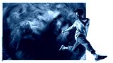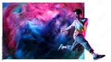 Professional break dancer posing in motion, practicing modern hip-hop dance against the background of abstract colorful smoke