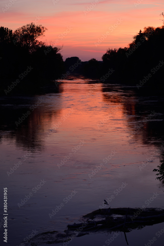 Sunset in the evening on a calm river, with dark trees on the edge, in portrait format