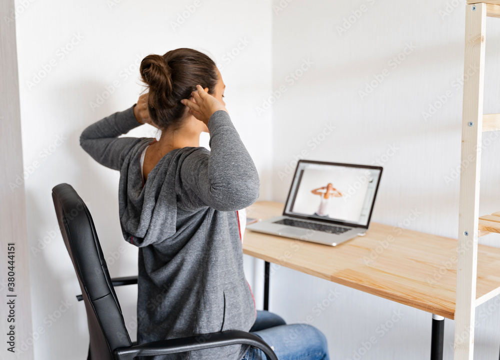 Woman doing stretching yoga at her office by online sport video. Fitness at work.