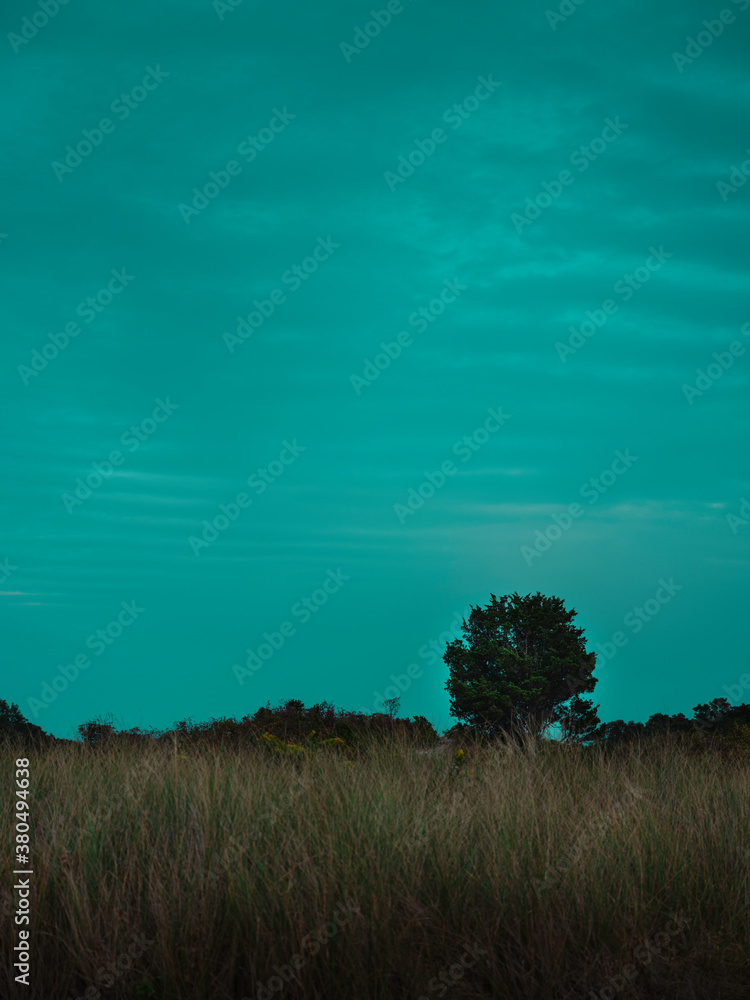 Landscape with a cedar tree in the grass field on turquoise-colored sky backgrounds at Twilight on Cape Cod