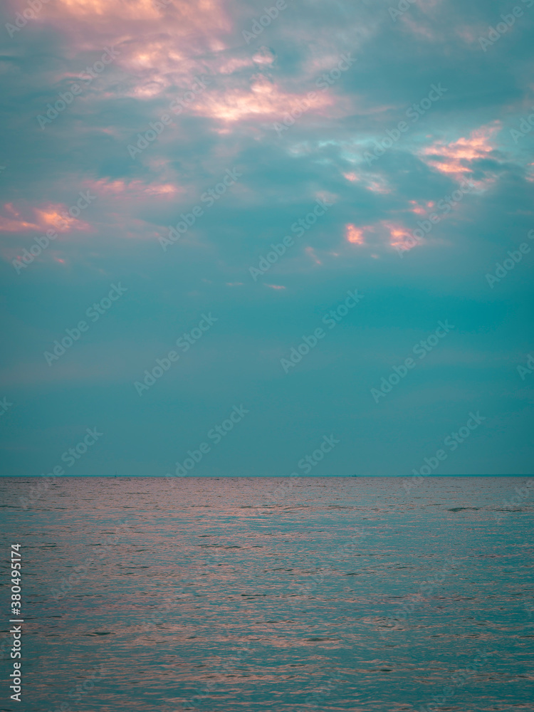 Dramatic Pink Sun Rays behind Turquoise Colored Sky and Reflections on the Sea Water at Twilight on Cape Cod