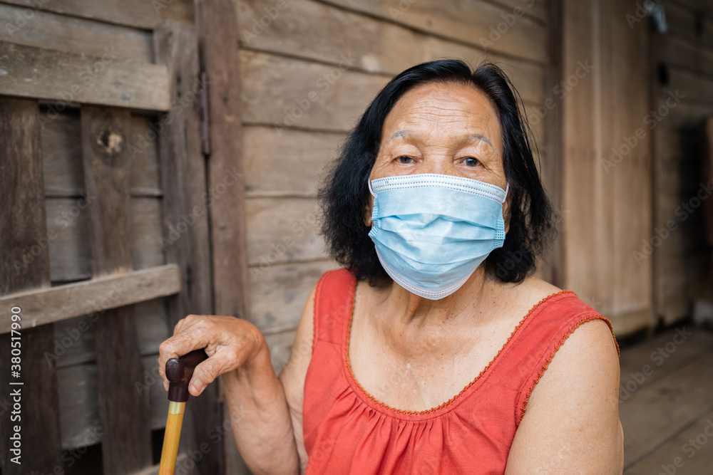 Thai elderly woman in round-necked sleeveless collar wearing medical mask for protect corona virus (covid-19) pandemic in wooden home