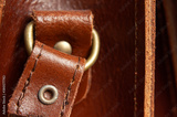 Fashionable brown women's bag made of genuine leather close-up. Leather bag texture. Fashion concept Details of leather bag belt metal buckle clasp thread stitching macro shot Stylish female accessory
