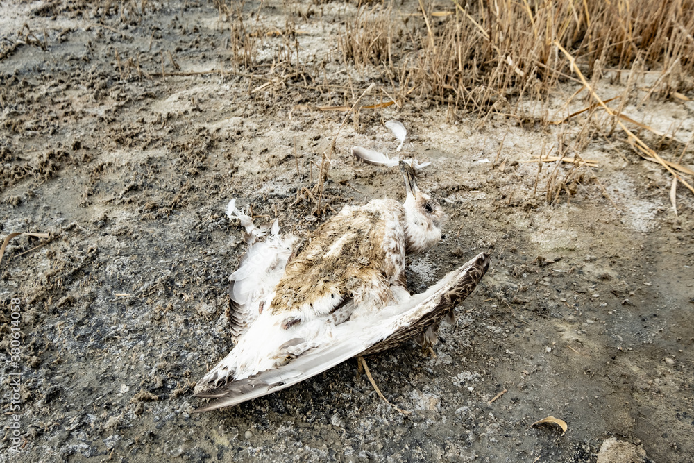 Landscape with dead seagul in the dry lake, global warming and ecology problem concept