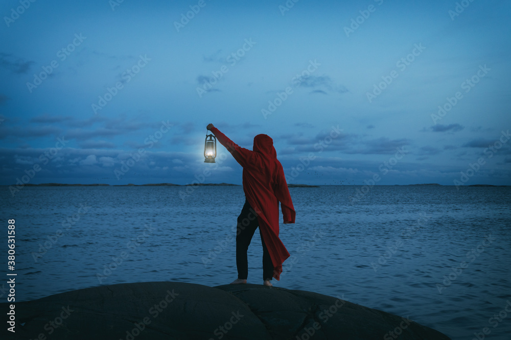 Back view of man in red cloak with lantern. Landscape in stormy weather. Halloween concept.