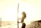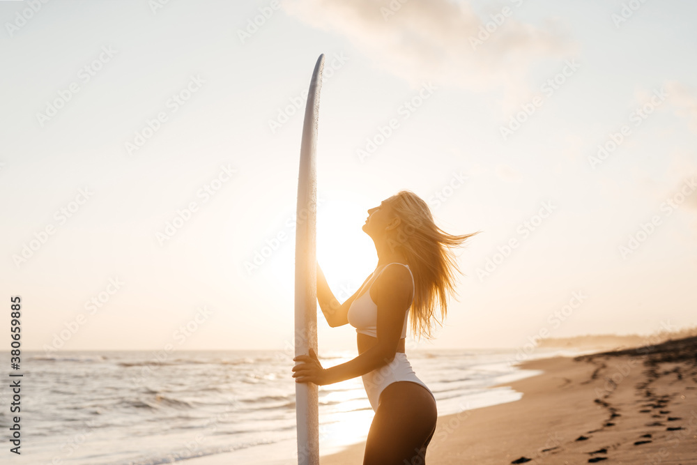 Beautiful surfer woman on the beach at sunset. Bali Indonesia.