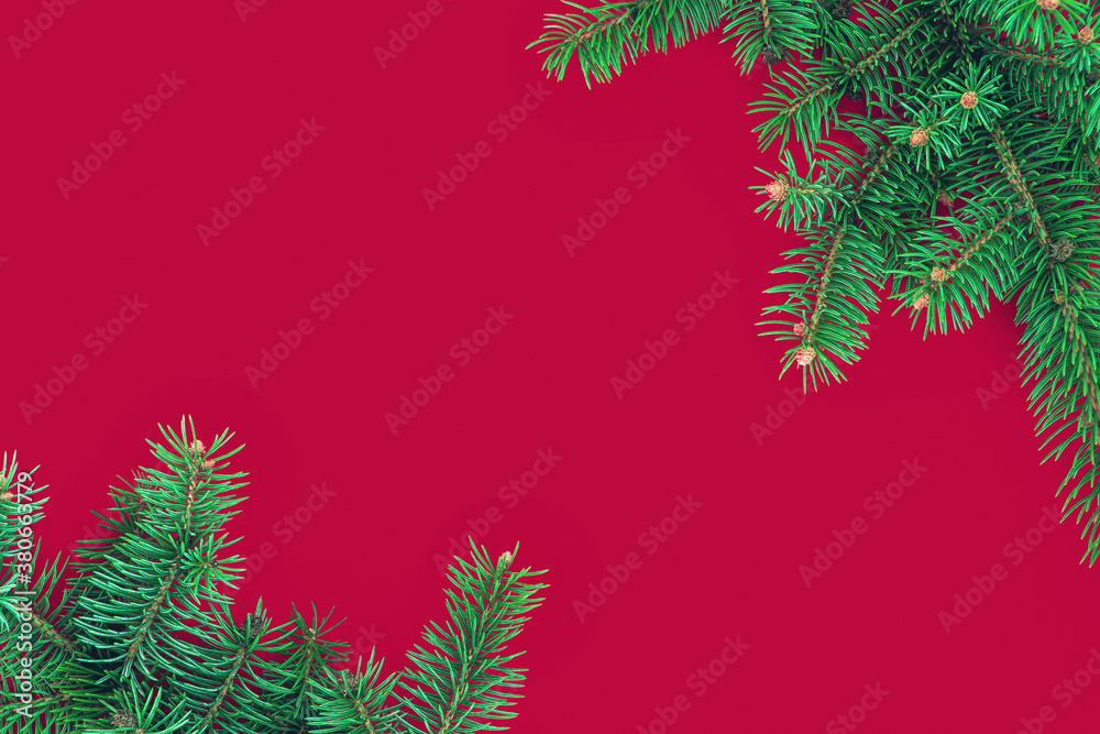 Festive composition with border of fluffy dark green fir branches on red background. Top view, flat lay style, copy space for text.