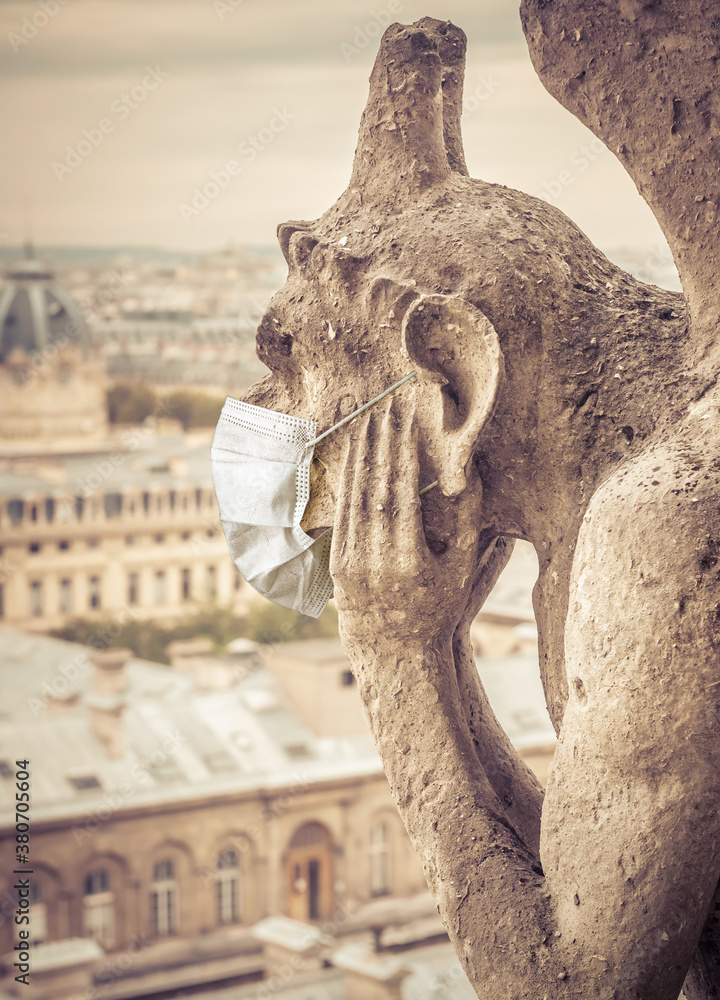 Corona virus in France, surgical mask on gargoyle of Notre Dame in Paris.