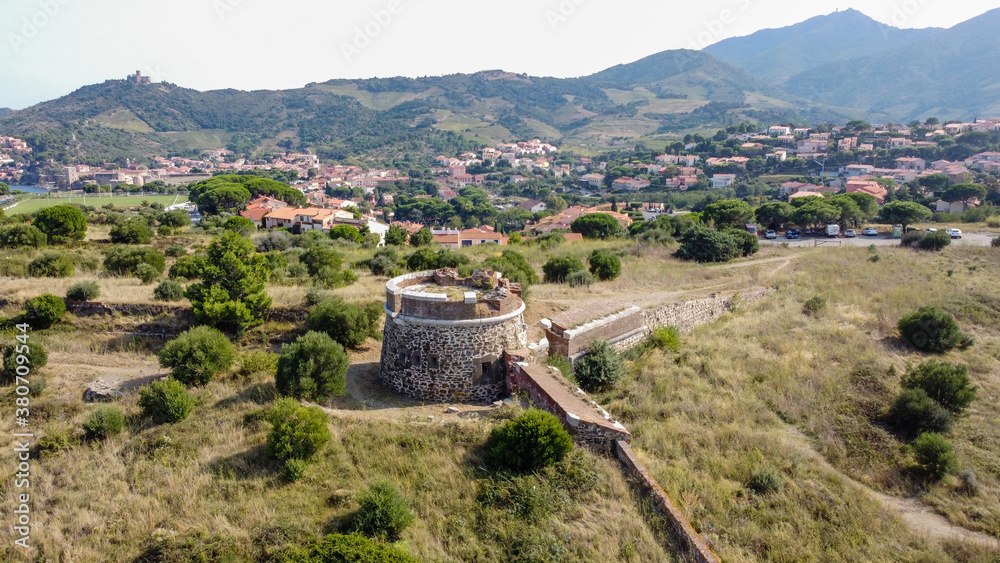 Aerial view of the Fort Rodon near Collioure along the coast of the Mediterranean Sea in the South of France - Catalan fortification in the Eastern Pyrenees