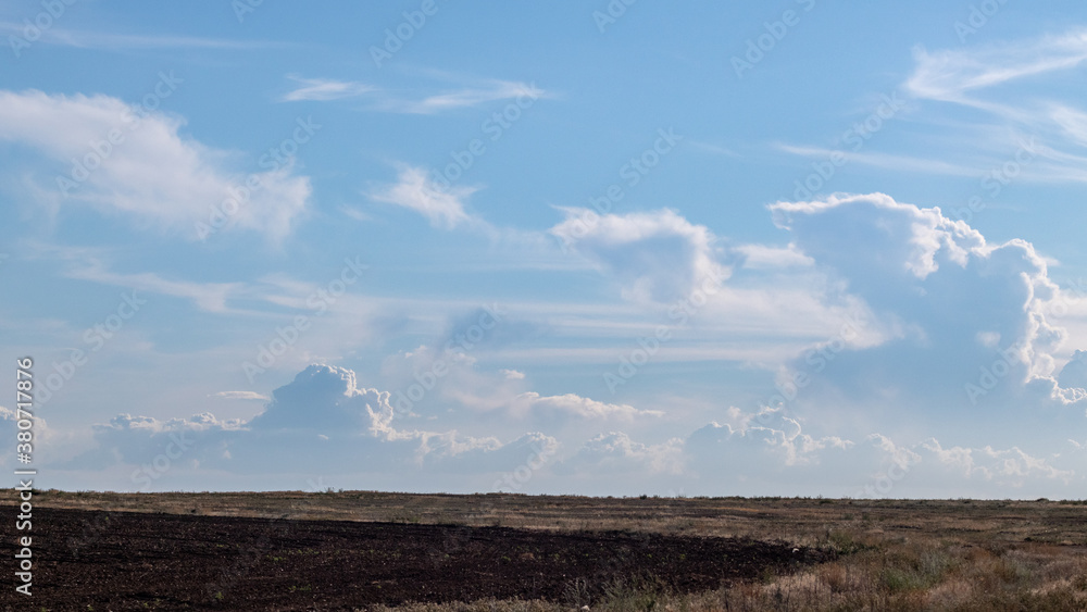 Autumn cultivated land rural dirt earth bare field with blue gorgeous clouds. Plowed field with blue cloudscape