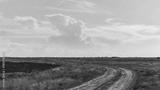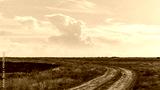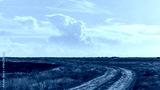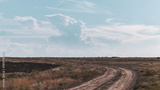 Dirt road in wild autumn prairie going forward to horizon in blue gorgeous clouds. Fields driving with blue cloudscape