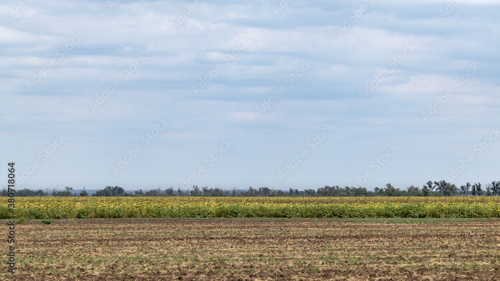 Field harvest time in countryside, green trees in distance and cloudy sky. Agriculture cultivation collection time