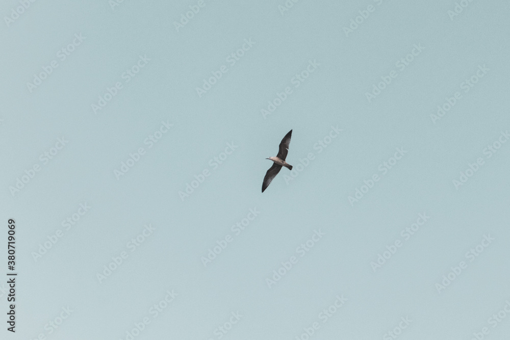 Seagull flying scenery. Bird symbol of freedom in blue light sky. Be free