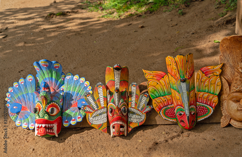 Oriental ethnic masks in Sri Lanka, traditional souvenirs.