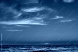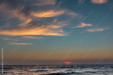 Sunset sun down hidden on horizon with stormy waves sea shore and epic colorful clouds lightened by warm sun