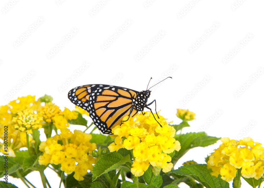 Close up of one Monarch Butterfly on yellow lantana flowers, profile view. Isolated on white.