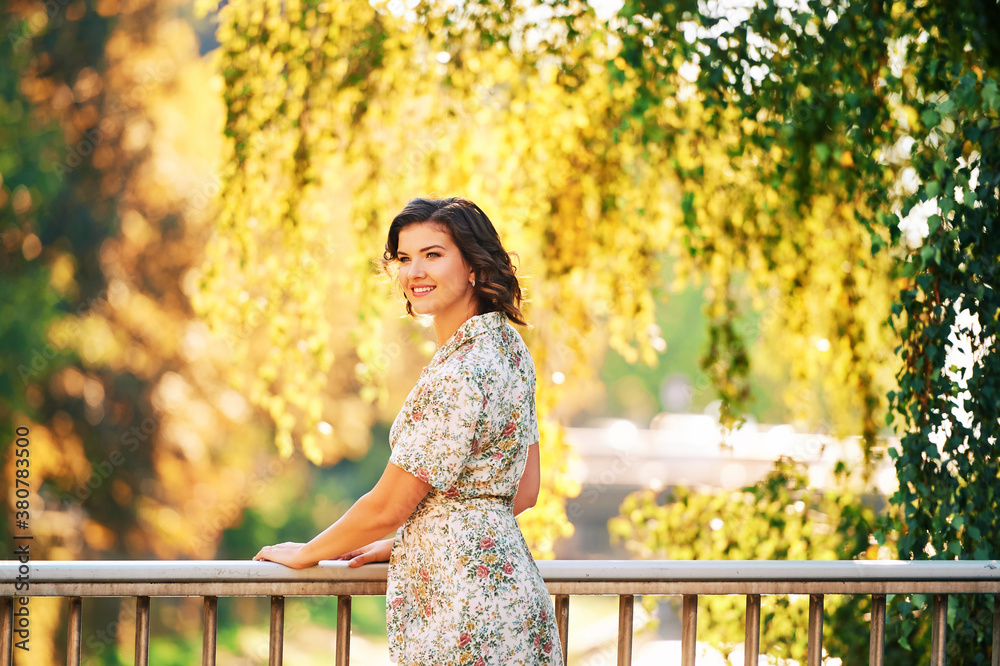 Outdoor portrait of pretty woman in warm golden light, young female model enjoying nice day in sunny park