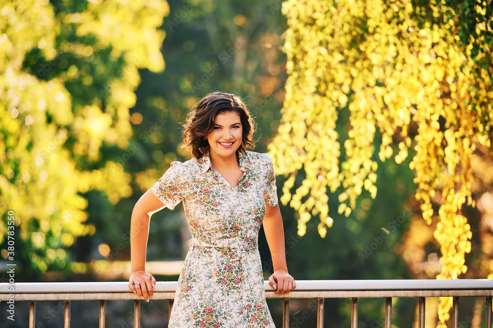 Outdoor portrait of pretty woman in warm golden light, young female model enjoying nice day in sunny park