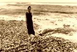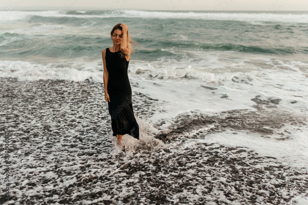 woman on beach is enjoying serene ocean nature during travel holidays vacation outdoors sunset time