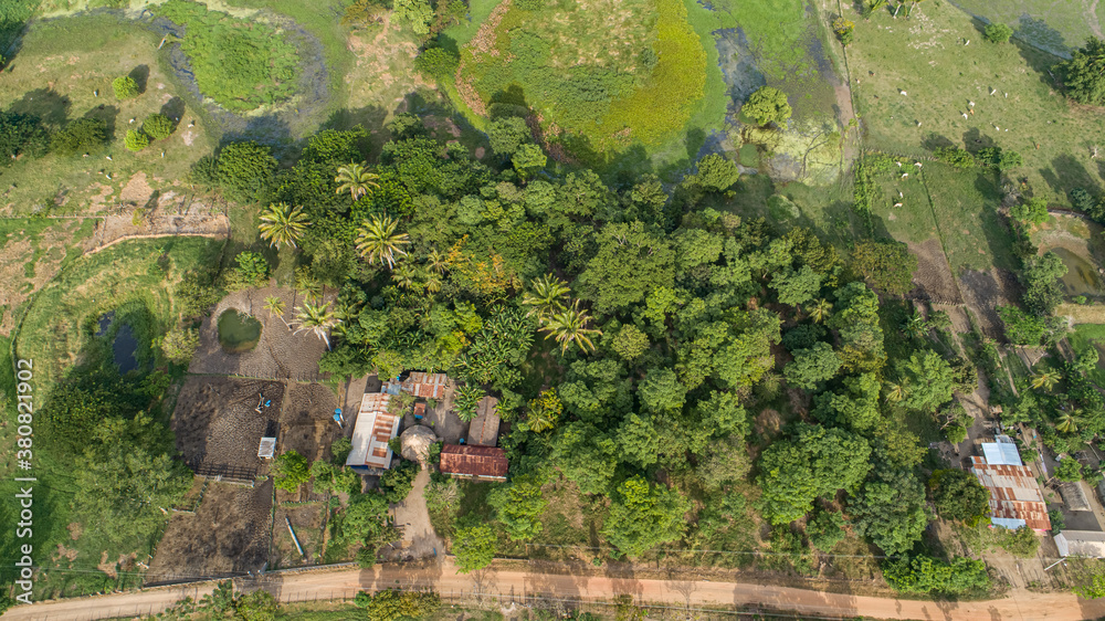 Vertical aerial view of rural landscape with a farm and trees near Mompos, Colombia