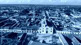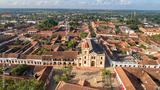 Aerial view of historic church and park Immaculada Concepcion (Immaculate Conception) in Santa Cruz de Mompox in sunlight, World Heritage