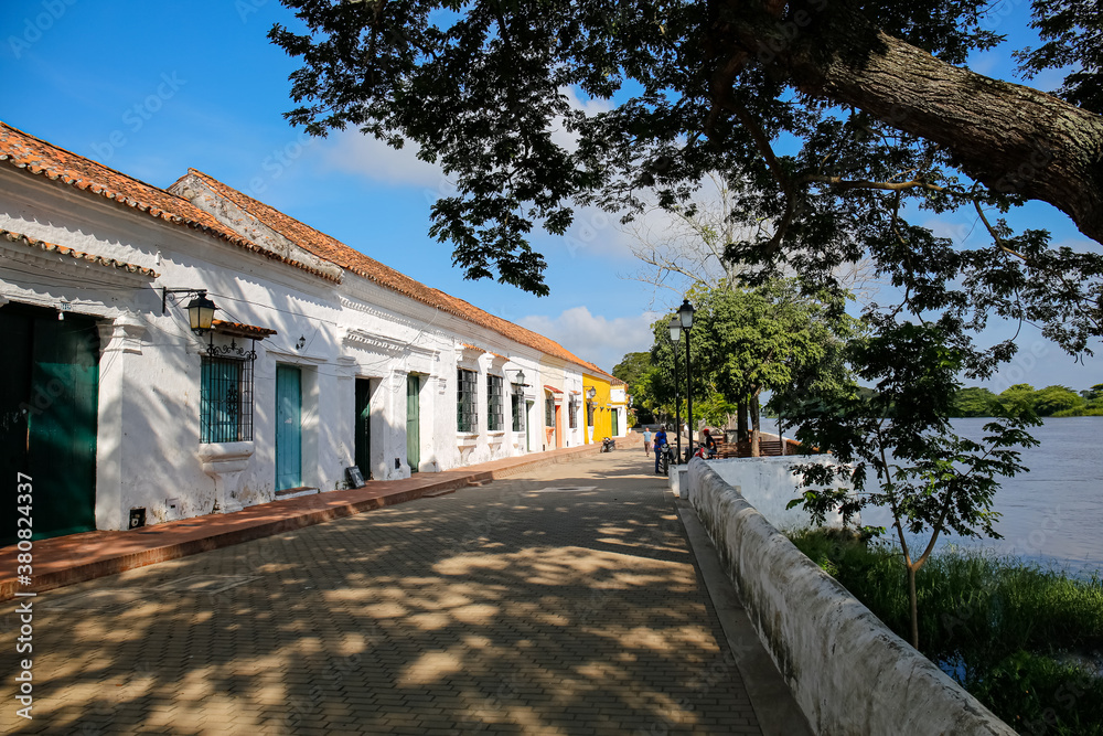 River promenade with typical historic houses, trees and river, Santa Cruz de Mompox, Colombia, World Heritage