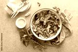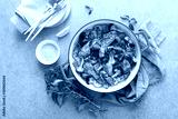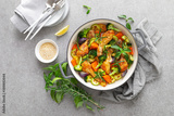 Chicken drumsticks roasted with vegetables in cast iron pan on kitchen table, top down view