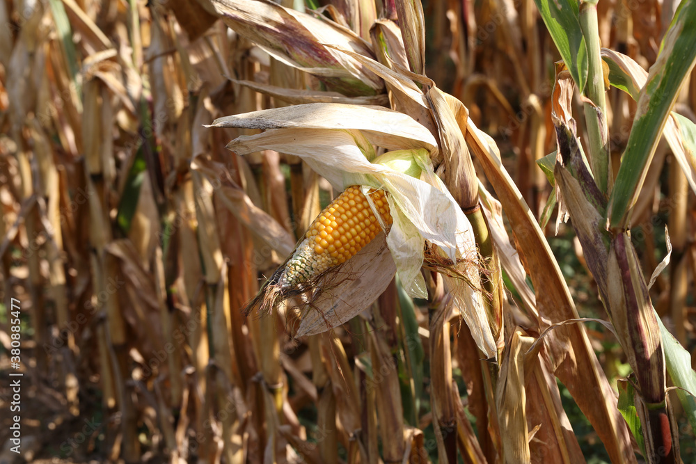 Closeup corn on the stalk in the corn field