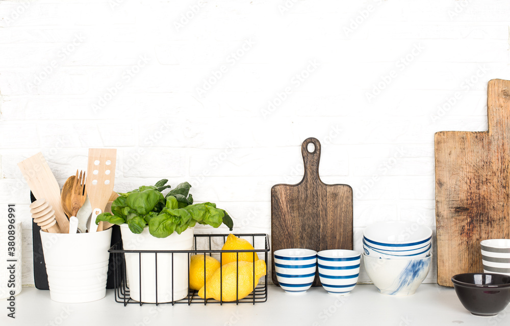 Kitchen table shelf with cutlery, spoons, spatulas, fresh basil, cutting boards, fresh vegetables, lemon on a simple wall. Horizontal, space,