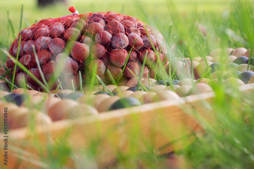 Nuts from the forest hazelnuts on a retro counting device on the autumn grass
