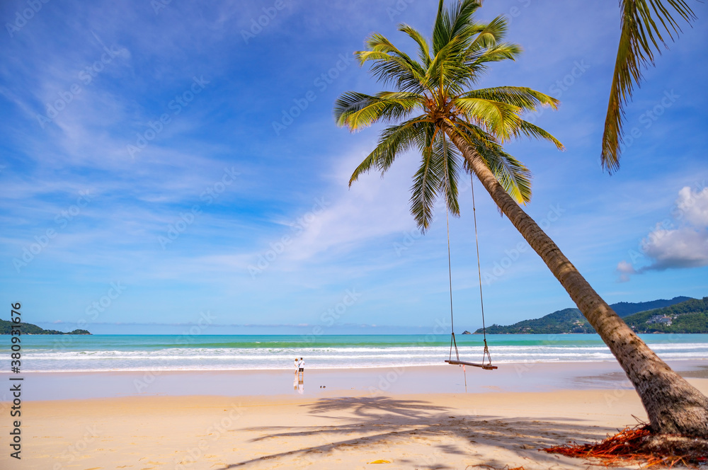 Summer beach with palms trees around in Patong beach Phuket island Thailand, Beautiful tropical beach with blue sky background in summer season.