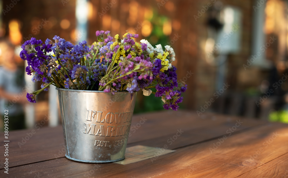 Bouquet of summer flowers in vase on table on terrace. Fresh Field flowers in vase, closeup. Cozy home decor of patio yard. Still life. Women day or wedding concept. festive background