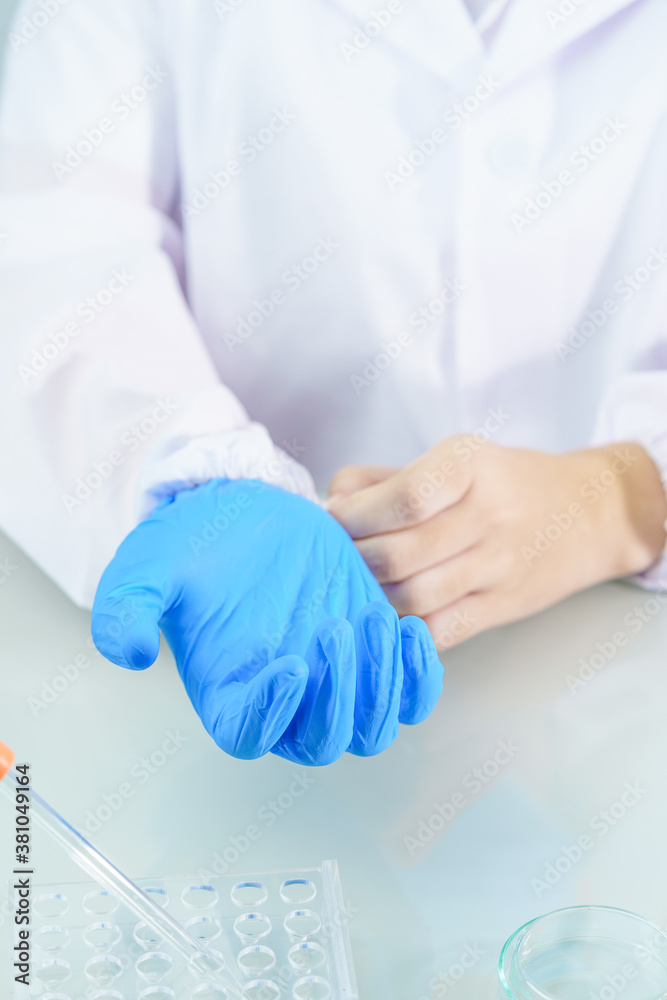 Scientist hands putting in nitrile blue latex gloves in labcoat wearing nitrile gloves