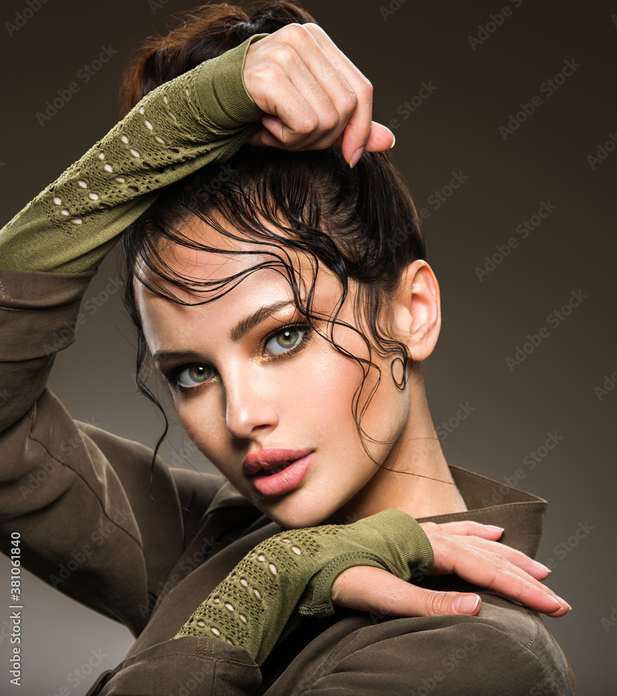 Closeup portrait of a beautiful young fashion woman with glamour makeup posing at studio.