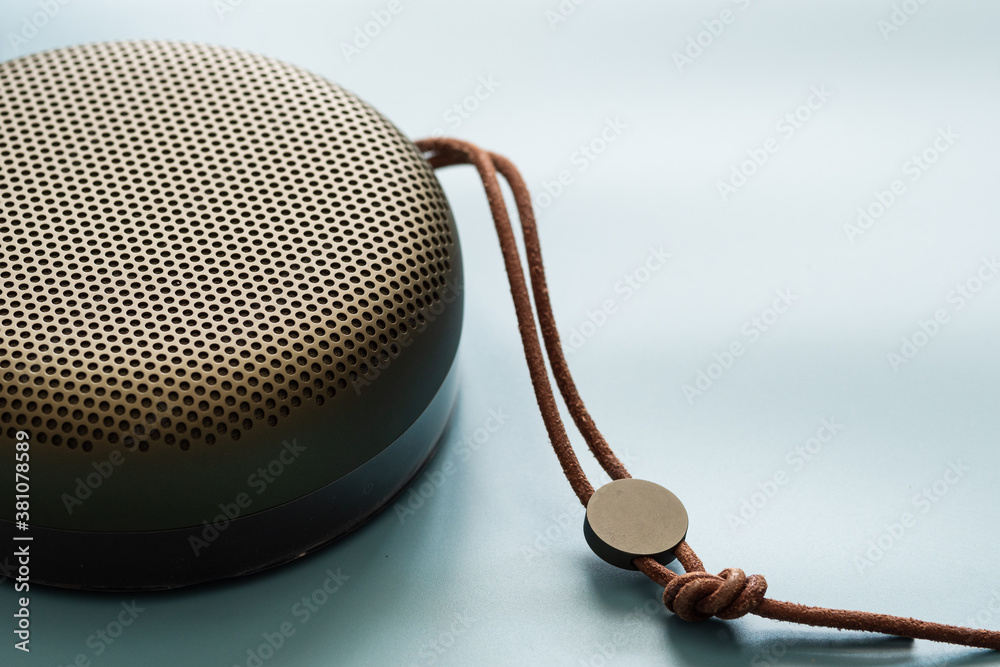 Green premium bluetooth speaker and copy space on blue light background color mood and tone style