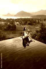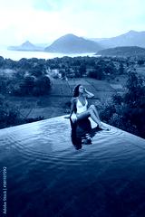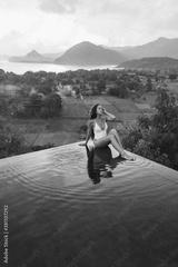 Dream journey in Asia. Woman sitting on edge luxury infinity pool an enjoying amazing mountain, rice terraces and coastline view at sunset. Inspiration travel destination.